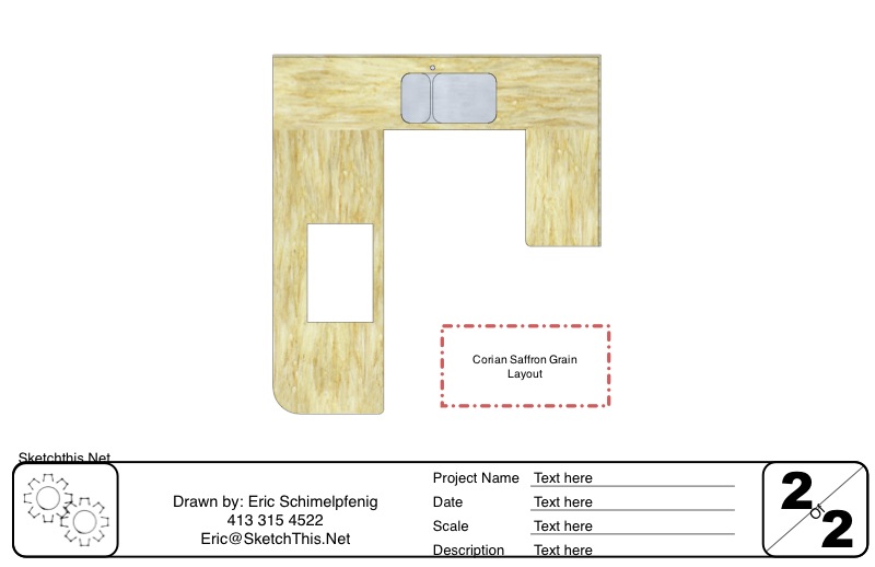 Enter my solution. The picture below is a Sketchup model. It was drawn to accurate dimensions, and the texture is an actual picture of a Corian Saffron slab. I was able to draw the countertop, draw in the seams, place and rotate the textures, all in minutes.